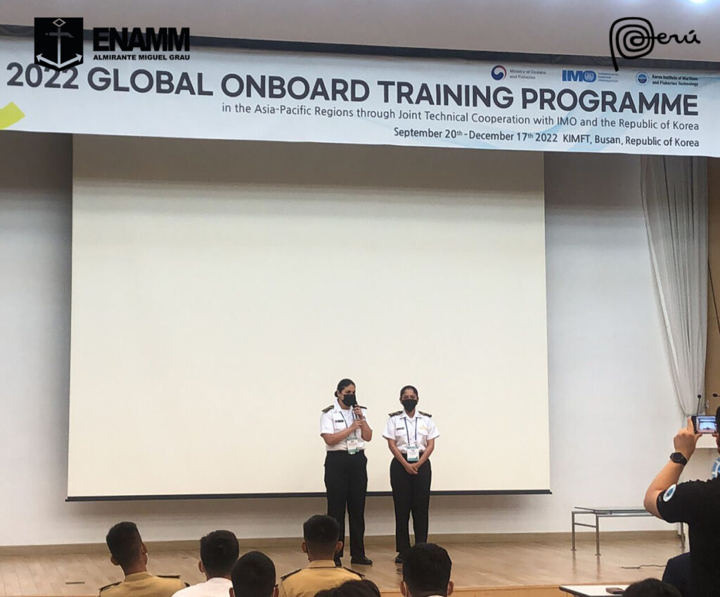 Las representantes de la Escuela Nacional de Marina Mercante “Almirante Miguel Grau” cadetes de 4to año de la especialidad de Máquina y Puente empezaron la capacitación de entrenamiento del Programa Global Onboard Training 2022 organizado por The Institute of Maritime and Fisheries Technology of Korea (KIMFT).