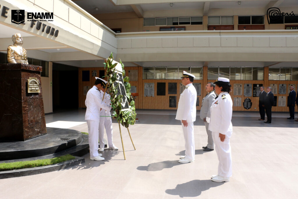 Durante la ceremonia se hizo la entrega de una ofrenda floral a cargo del Señor Director , el cual mencionó el honor que tiene este Centro Superior de Estudios en formar exitosos Oficiales Marinos Mercantes que se desempeñan a bordo de la especialidad de cubierta y máquinas en distintas embarcaciones, así como también en las principales empresas navieras nacionales y extranjeras, en el ámbito portuario, comercio exterior y operadores logísticos; por tanto la COMMPE es reconocida como una organización emblemática en donde debemos trabajar juntos en pro del Marino Mercante, desde esta su alma máter cuando y donde sea necesario.