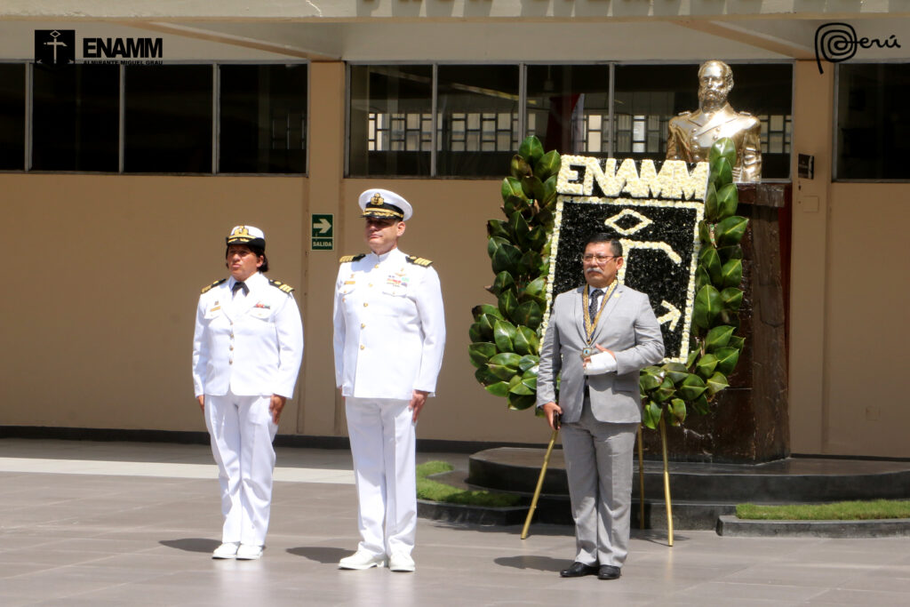 Durante la ceremonia se hizo la entrega de una ofrenda floral a cargo del Señor Director , el cual mencionó el honor que tiene este Centro Superior de Estudios en formar exitosos Oficiales Marinos Mercantes que se desempeñan a bordo de la especialidad de cubierta y máquinas en distintas embarcaciones, así como también en las principales empresas navieras nacionales y extranjeras, en el ámbito portuario, comercio exterior y operadores logísticos; por tanto la COMMPE es reconocida como una organización emblemática en donde debemos trabajar juntos en pro del Marino Mercante, desde esta su alma máter cuando y donde sea necesario.