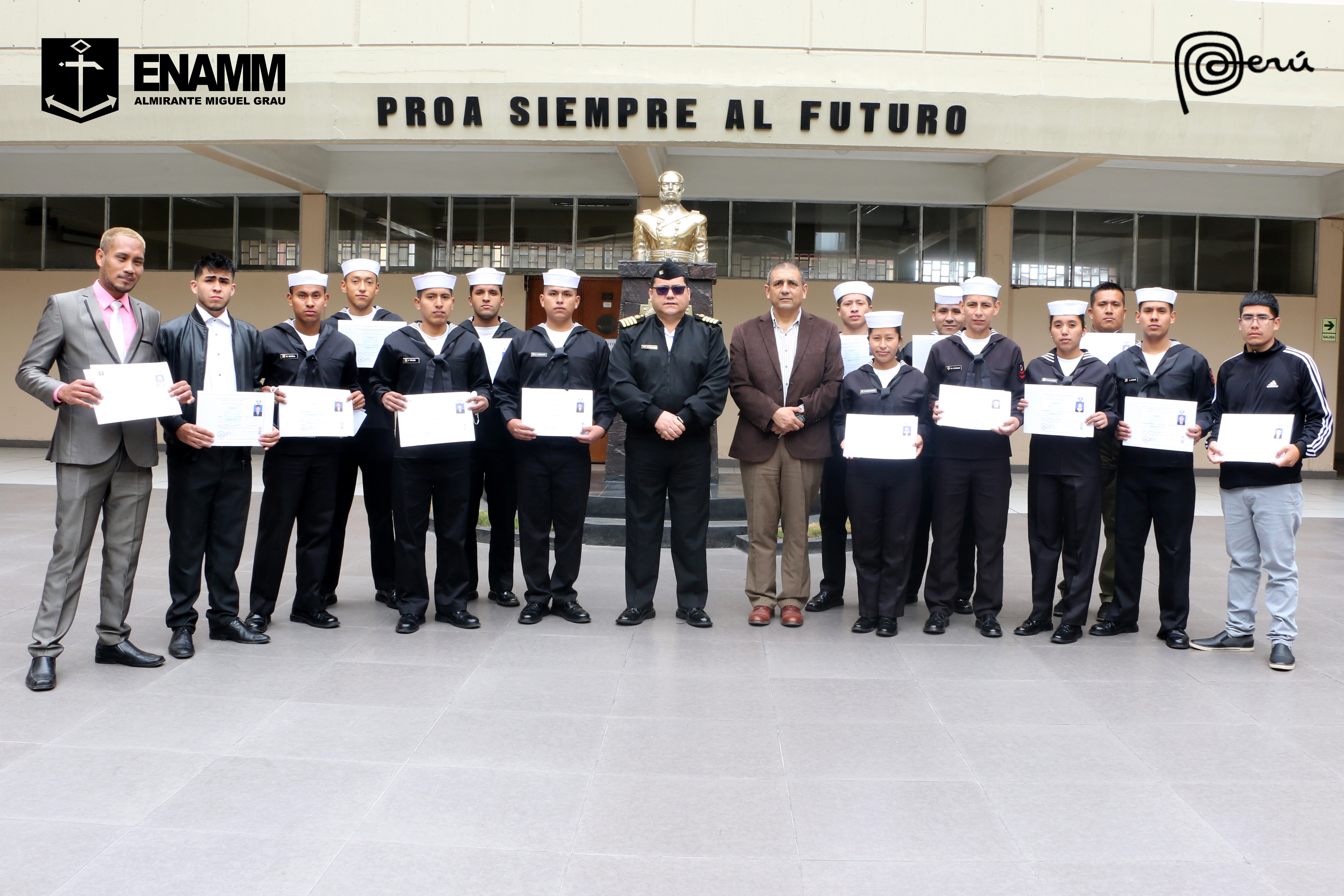 La entrega de certificados estuvo a cargo del señor Capitán de Navío Miguel Ángel DELGADO Céspedes Director de la Escuela Nacional de Marina Mercante, quien estuvo acompañado por el Director de Capacitación y Entrenamiento – DIRCAP, durante sus palabras de felicitación los exhortó a luchar por sus objetivos y desempeñarse eficientemente en sus labores futuras como gente de mar.
