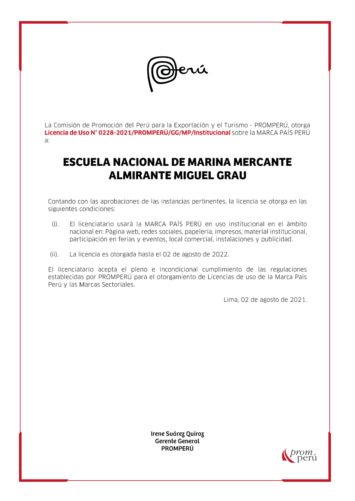 Este Centro Superior de Estudios obtuvo la autorización de la Comisión de Promoción del Perú para la Exportación y el Turismo (PROMPERÚ), para el uso de la “Marca Perú”, habiéndose emitido el certificado para uso institucional a favor de esta Escuela, la cual tendrá una vigencia hasta el 02 de agosto del 2022.