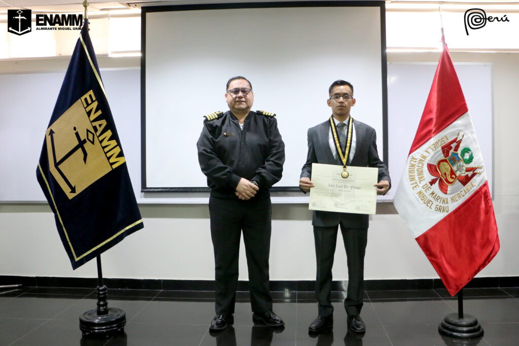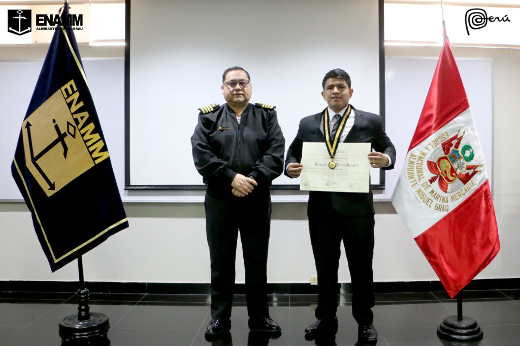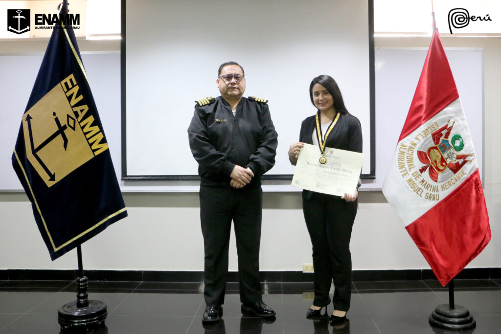 La Escuela Nacional de Marina Mercante “Almirante Miguel Grau”, felicita a los egresados Ximena Milagros ZORRILLA Minaya y Angie Harumi REQUENA MOSCOL, quienes recibieron el Título a nombre de la nación de Administración Marítima y Portuaria. También extendemos nuestras felicitaciones a Julio Jamil VITE Yenque y Francis Axel FLORES Morales, quienes recibieron el Título a nombre de la nación de Marina Mercante.